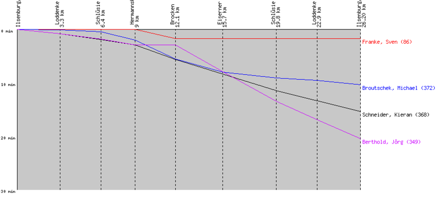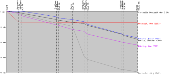 Dieses Rennen ist auch dank der vielen Zwischenzeiten über eine Grafik gut zu verfolgen und auszuwerten. Als Beispiel sollen die vor dem Rennen 5 Bestplazierten der AK Senioren2 im Harz-Cup gezeigt werden: